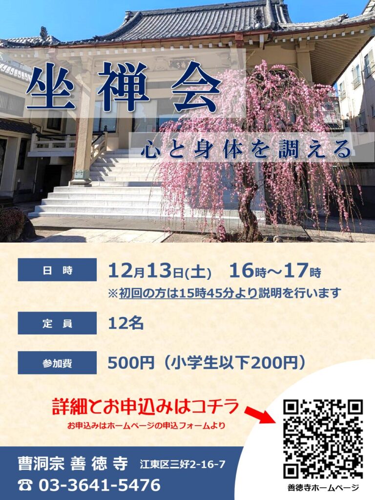 | 次回開催日 | 令和7年12月13日(土) 16時~17時 ・二回目以降の方は16時までにご集合ください ・初回の方は坐り方など説明を行いますので15時45分までにご集合ください ※上記日程は満員に達しました |